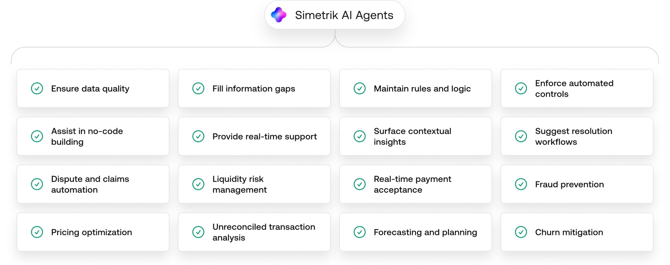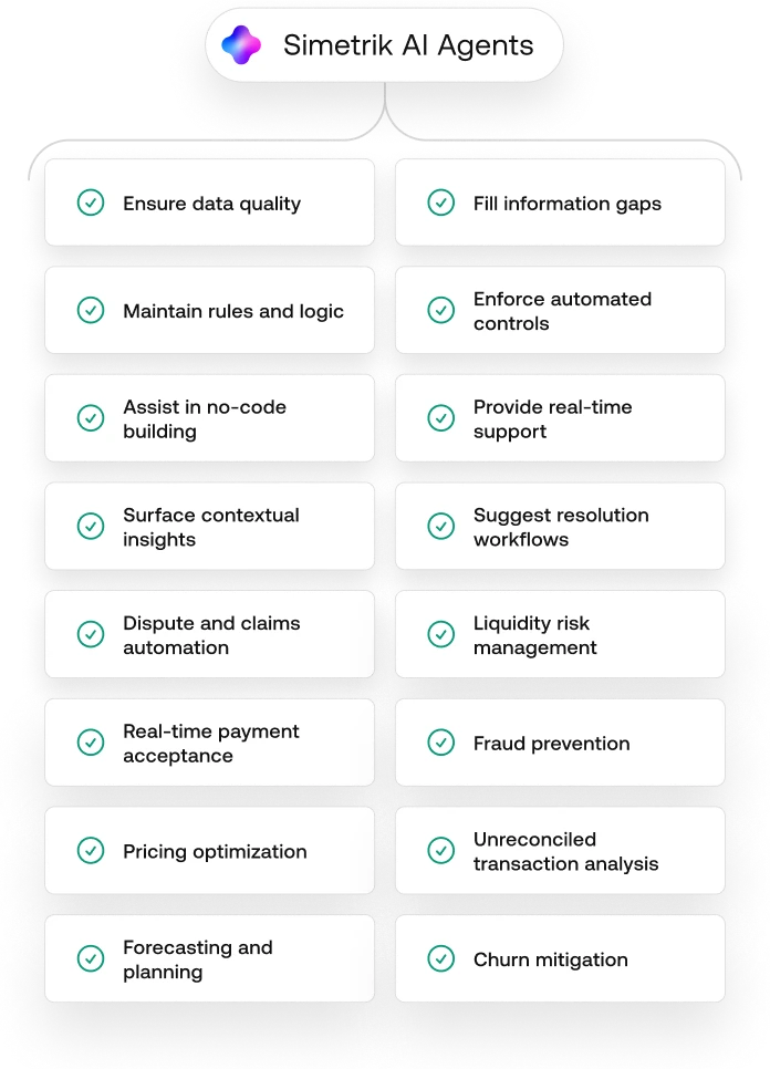 Simetrik’s AI agents help you manage highly complex reconciliation and compliance workflows at scale. Automate tasks, configure logic, and optimize every action for maximum ROI.