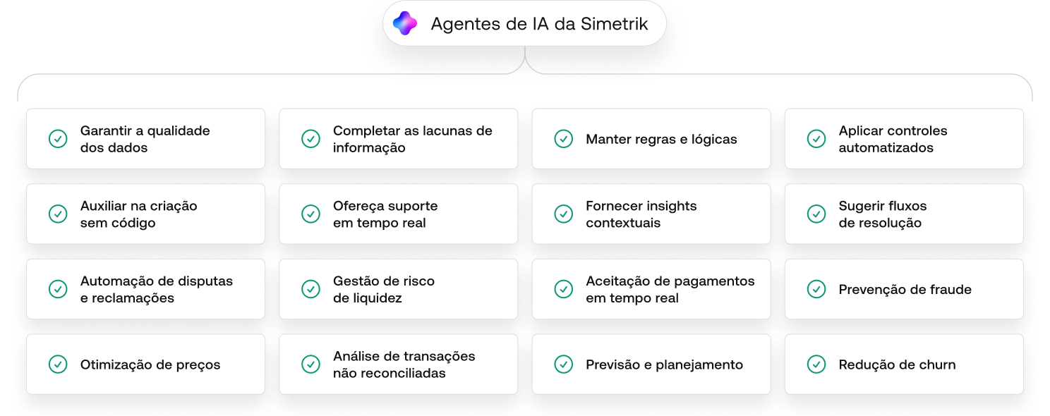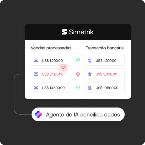 Os agentes de IA da Simetrik ajudam a gerenciar fluxos de trabalho de reconciliação e conformidade altamente complexos em grande escala. Automatize tarefas, configure lógicas e otimize cada ação para obter o máximo ROI.